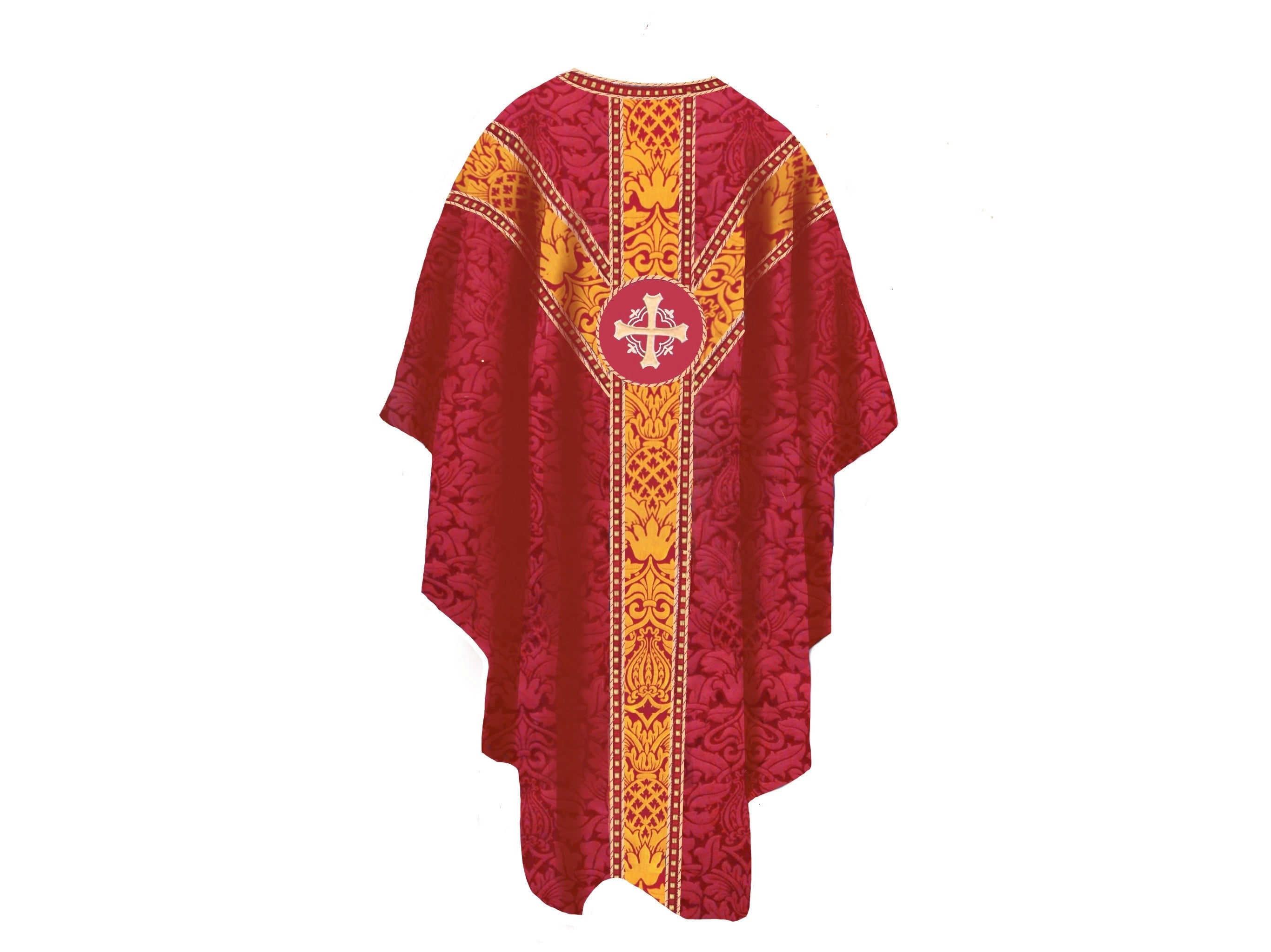 Chasuble, Stole, Maniple, Burse and veil in Fairford brocade, lined and decorated with contrasting fabric orphrey braided round