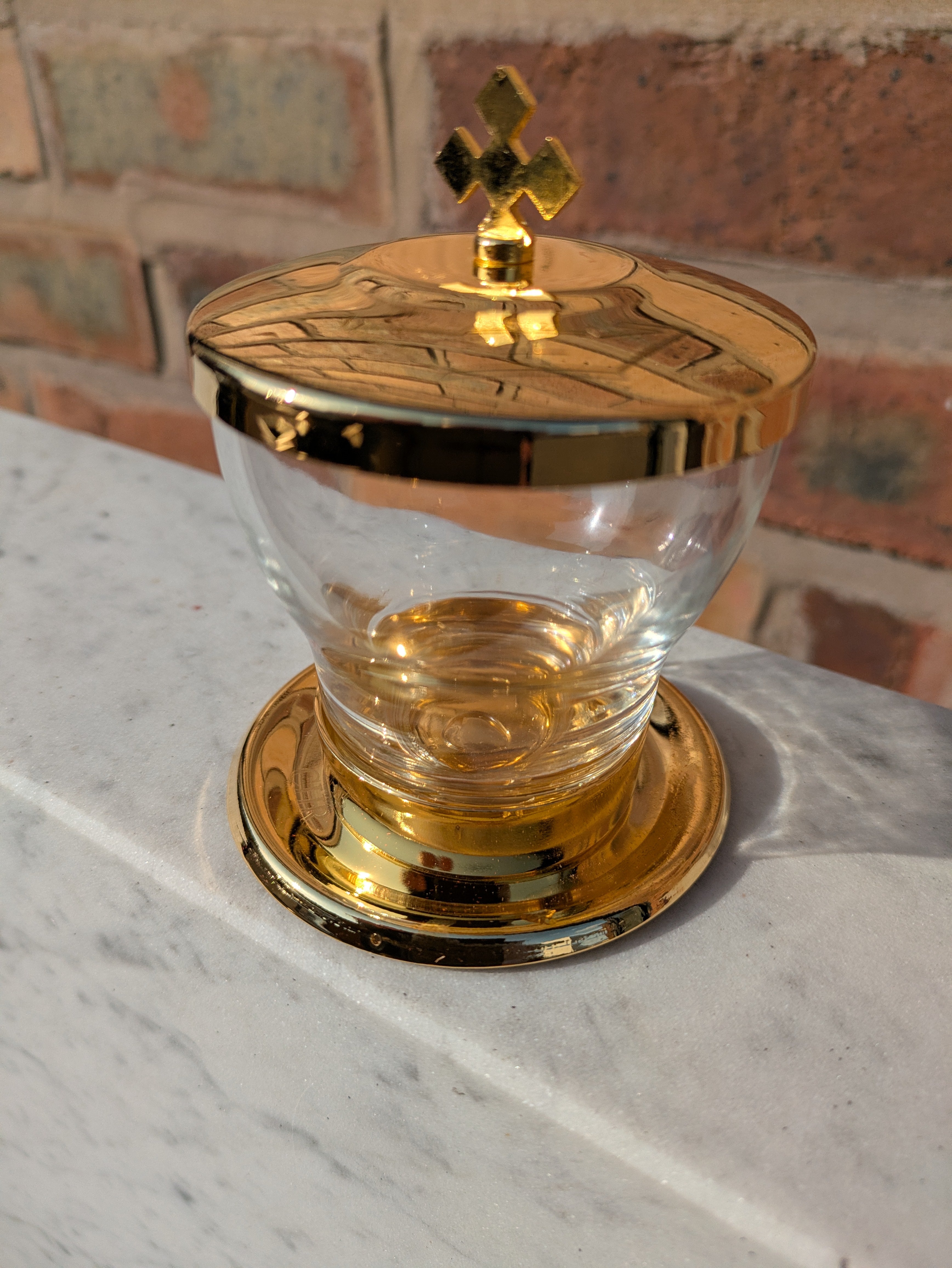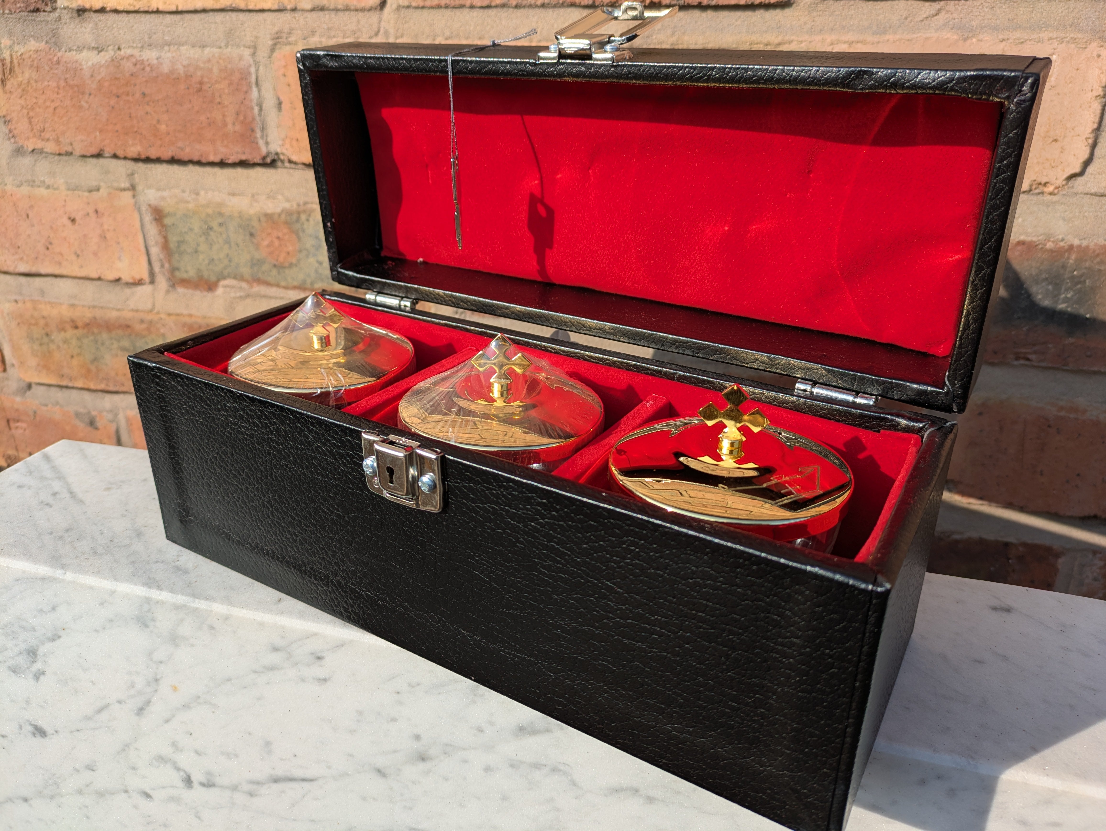 No.971 Set of 3 x Parish Holy Oil Stores in fitted case. Stores in glass with gilt bases and lids marked CHR, CAT & INF. Case overall sizes 27cm x 12cm x 10cm