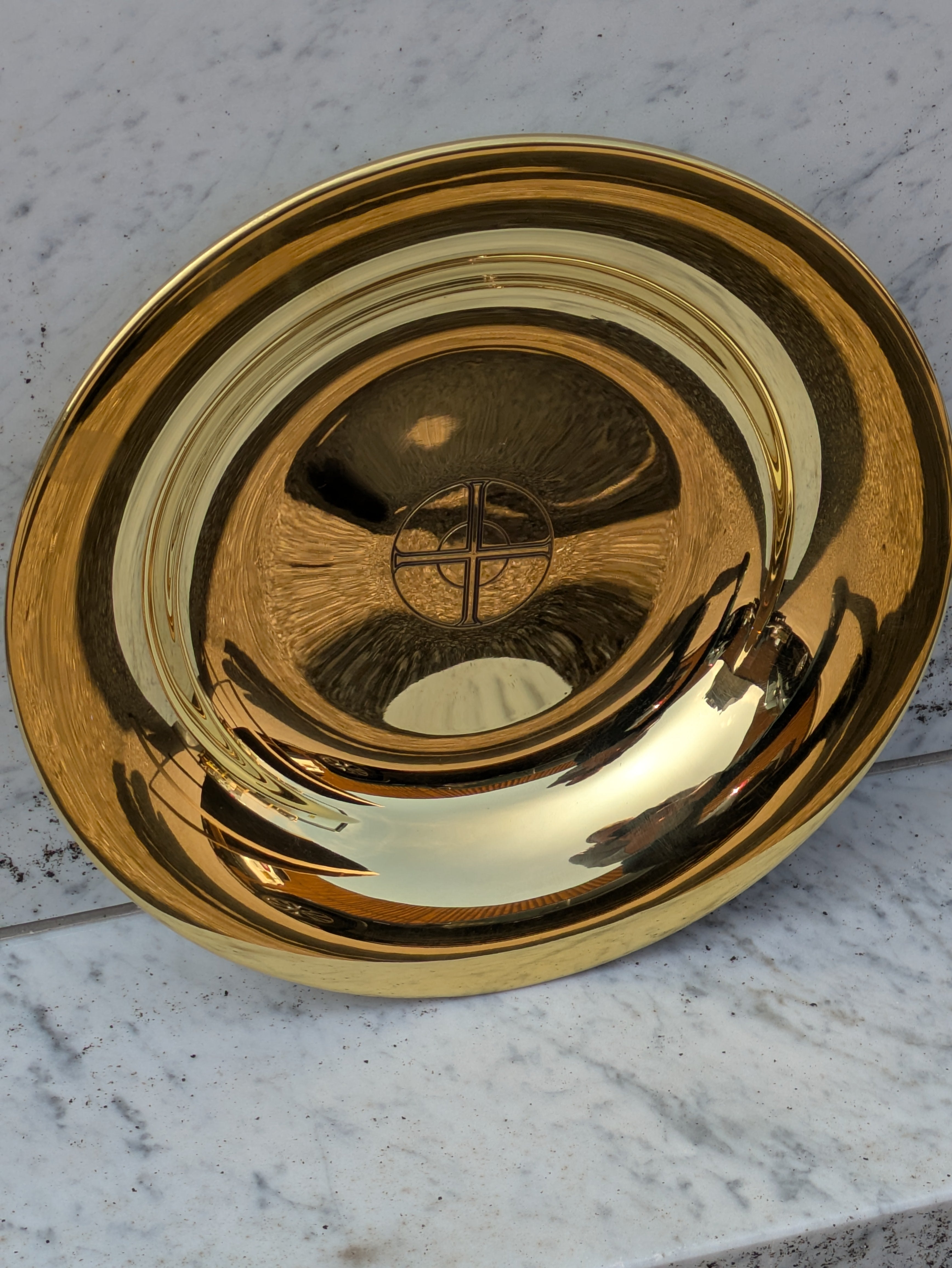 12" diameter Alms dish in polished brass 'Old English' design with engraved central cross