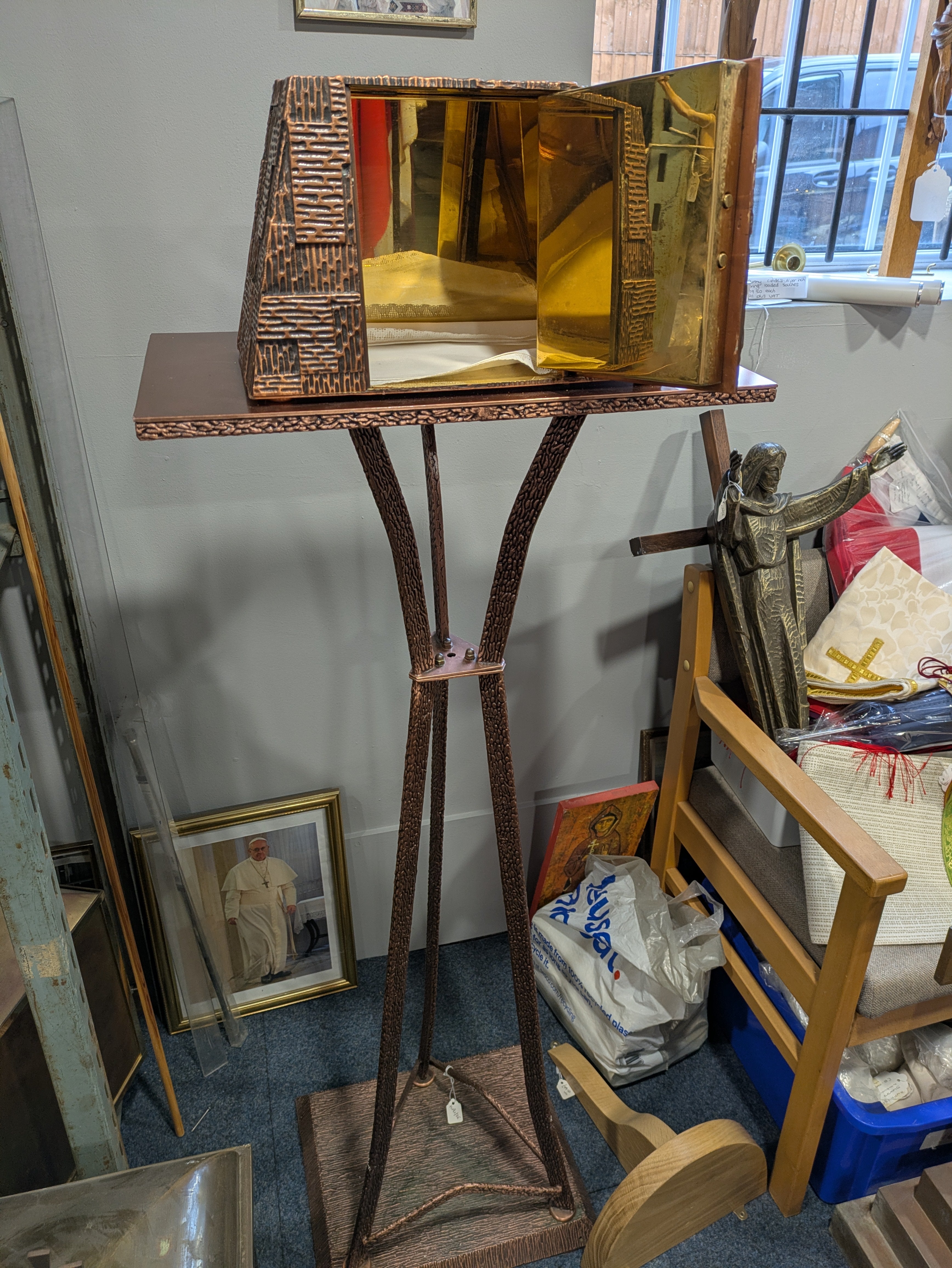 Tripod design Blessed Sacrament pedestal complete with 19 1/2" x 11 3/4" top and 13 1/2" x 7 3/4" x 8 1/4" high Tabernacle. All in textured copper/bronze finish. Tabernacle with gilt decoration to door and 1 x key only