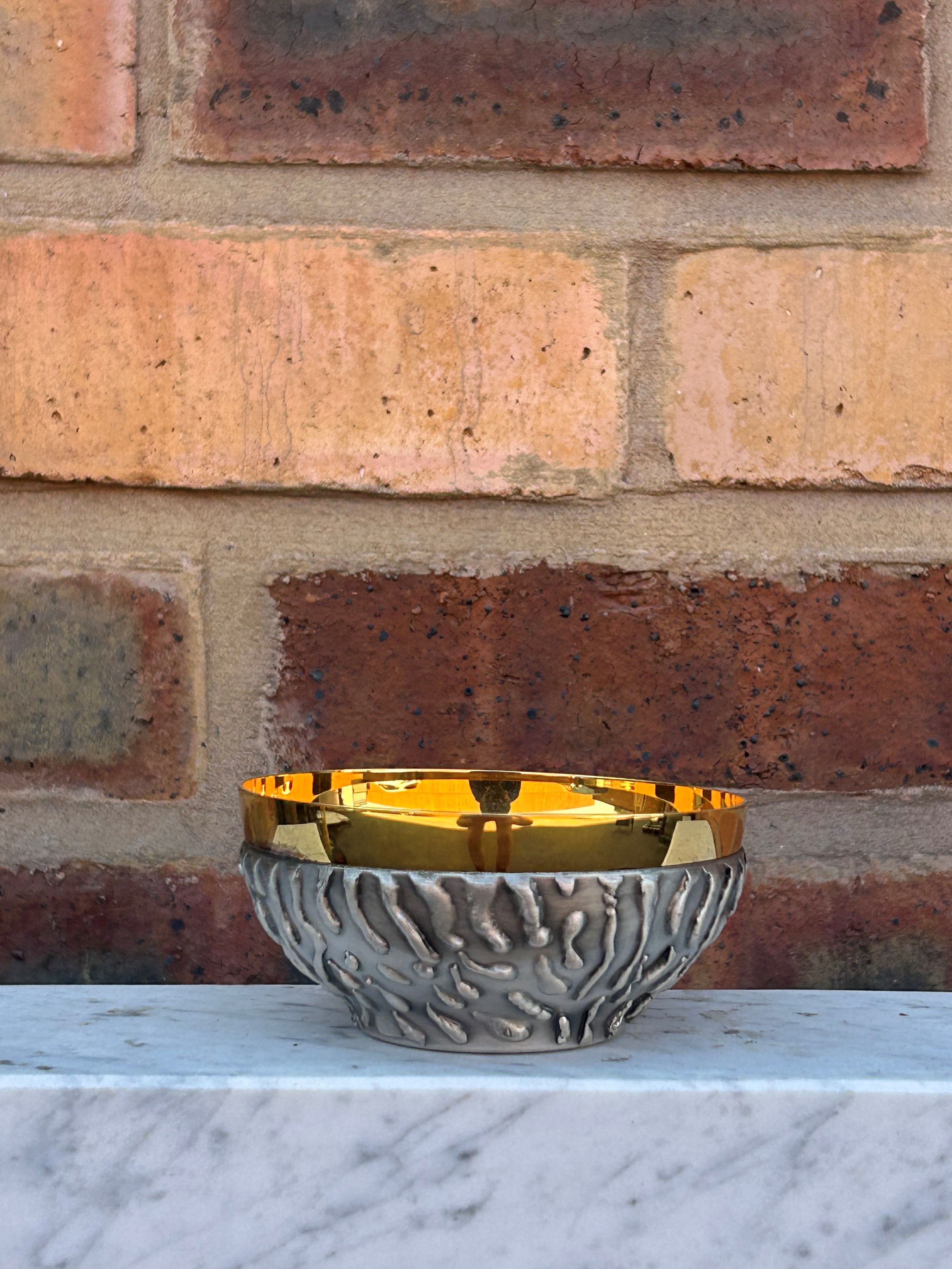 4" diameter open Ciborium with textured oxydised silver exterior, interior and lip gold-plated
