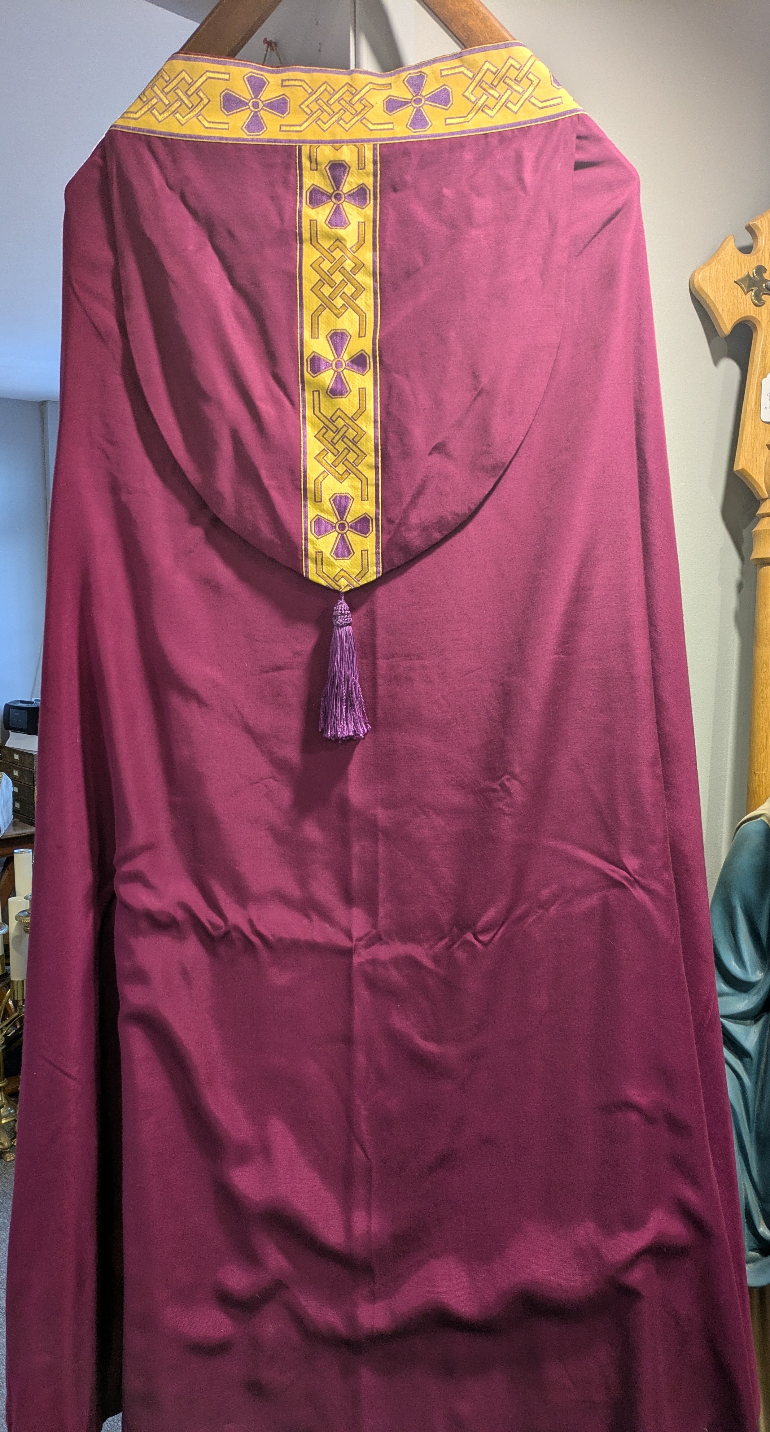 Cope in plain Roman Purple with orphrey decorated to hood and front panels