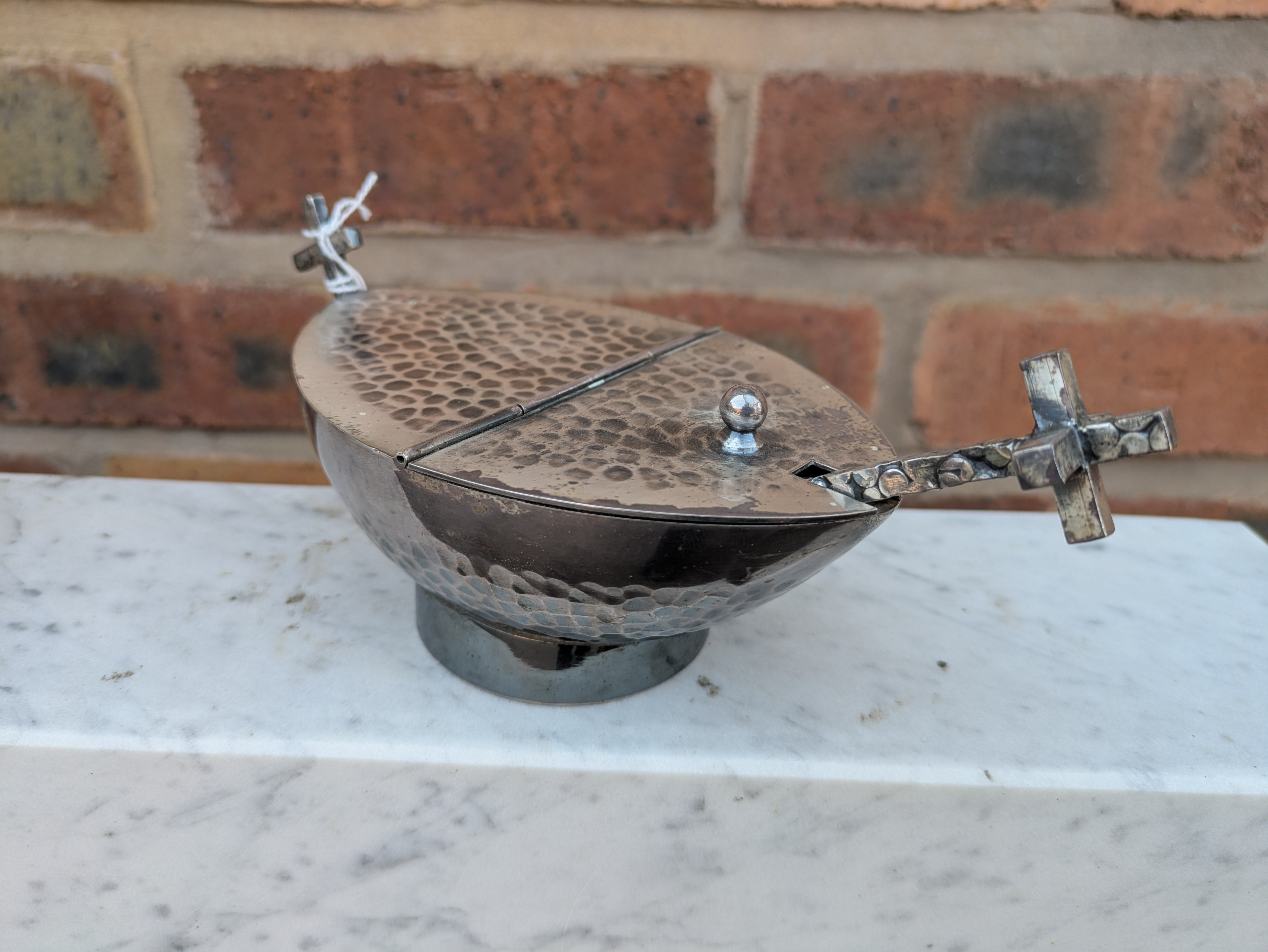 Contemporary Spanish design incense boat and spoon with silver-plated hammered finish