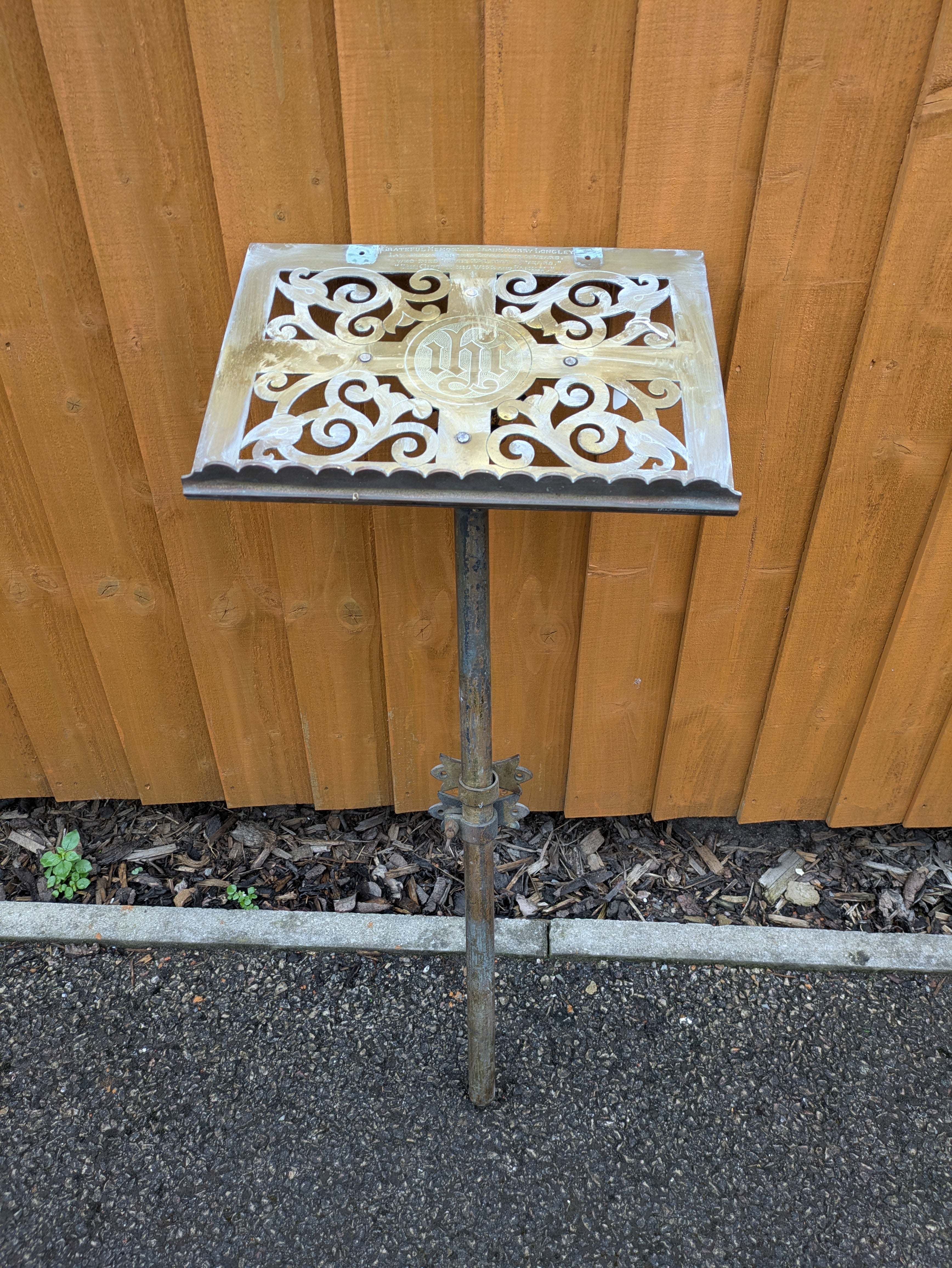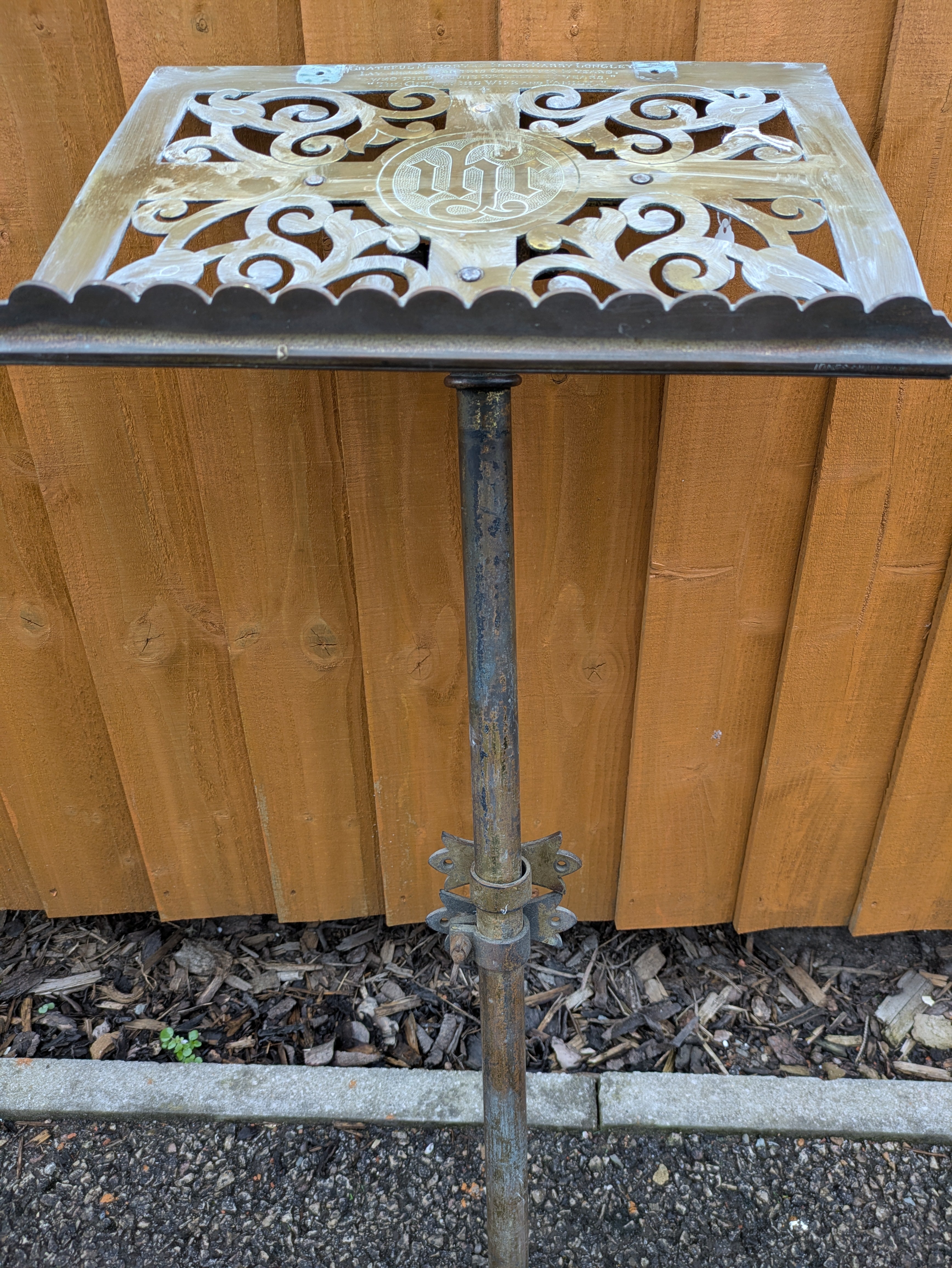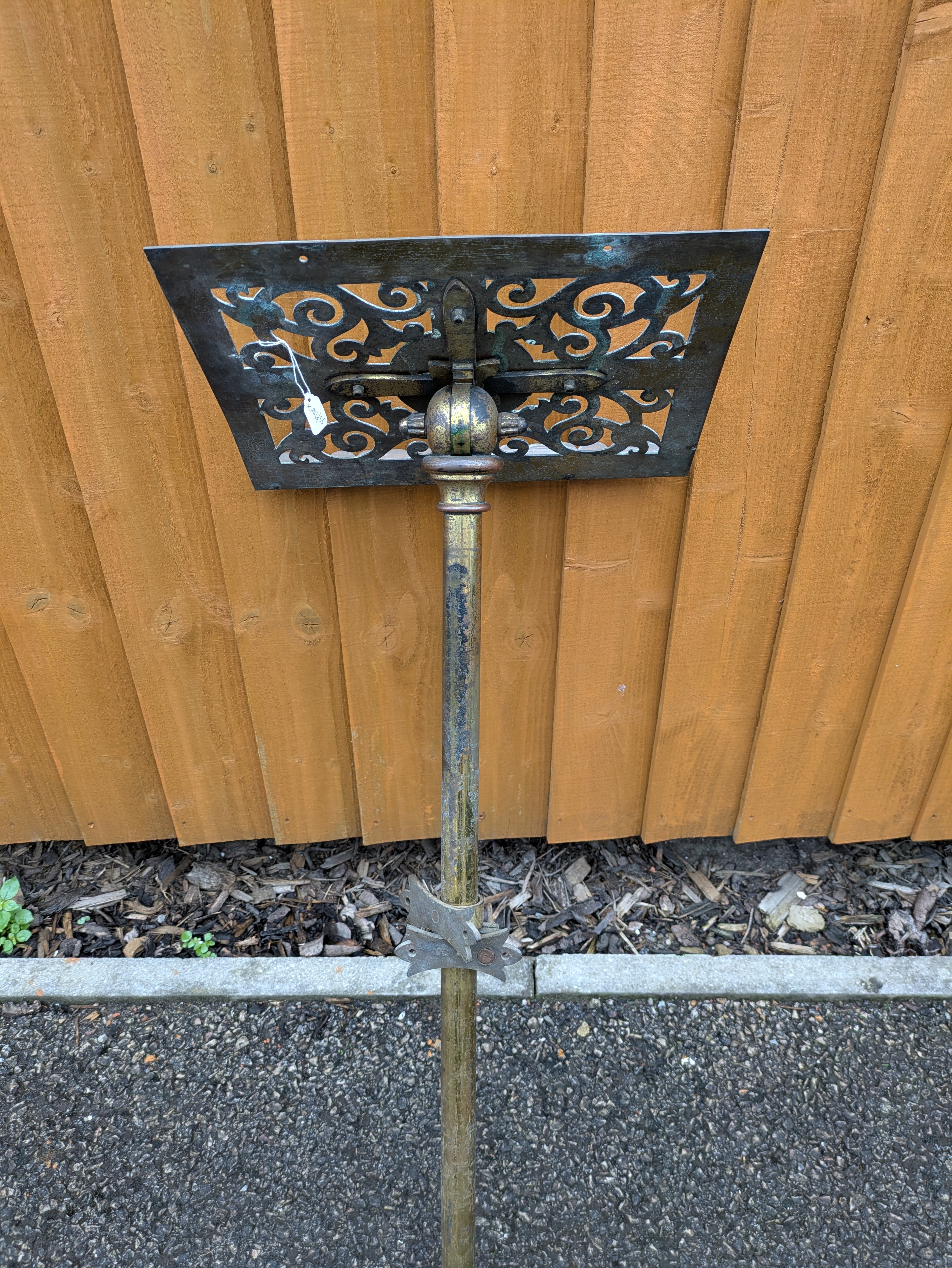 Adjustable brass pulpit missal stand, with pierced decoration to 14 1/2" x 10 1/4" bookrest, memorial engraving..................Frank Harry Longley................