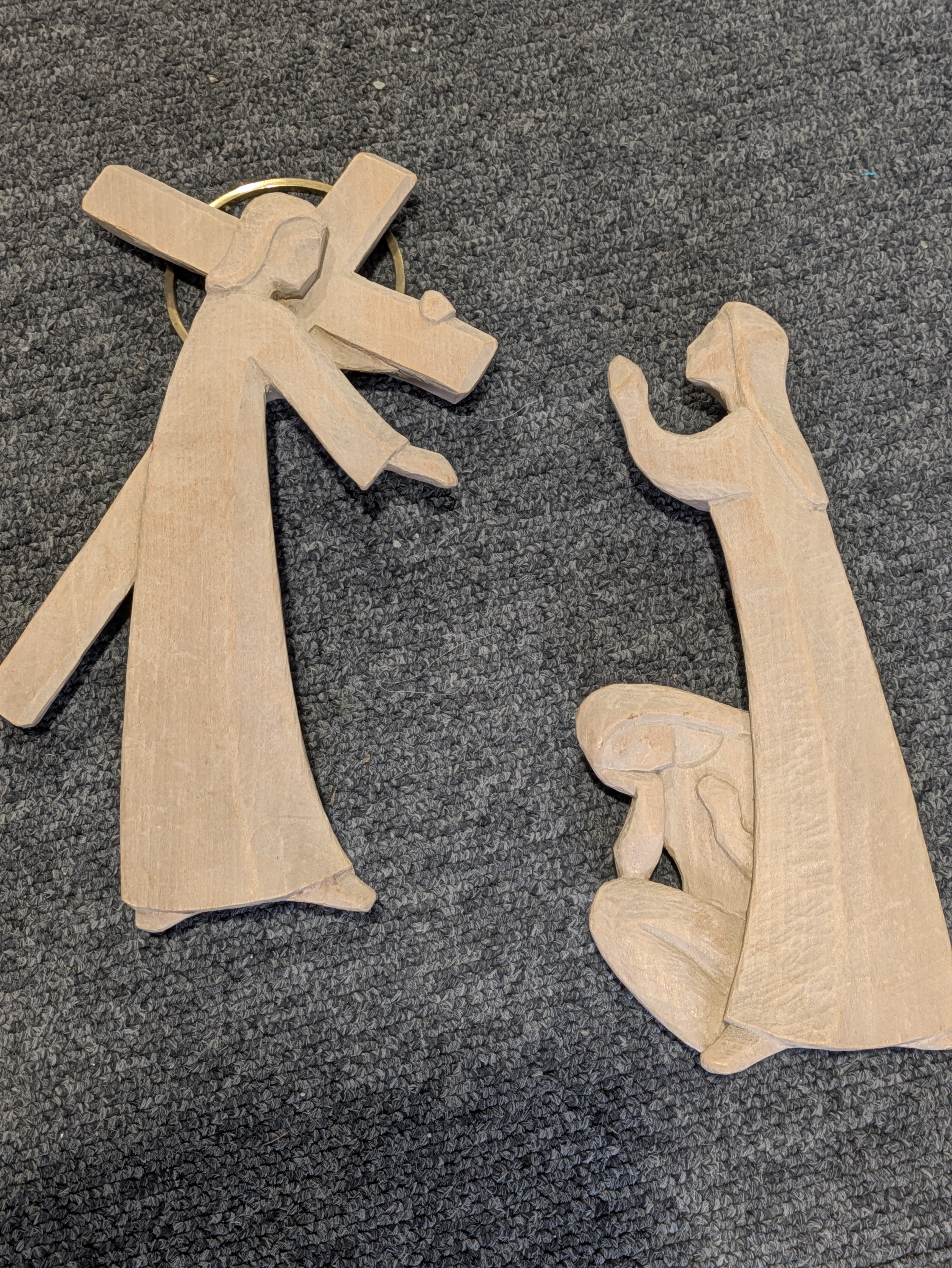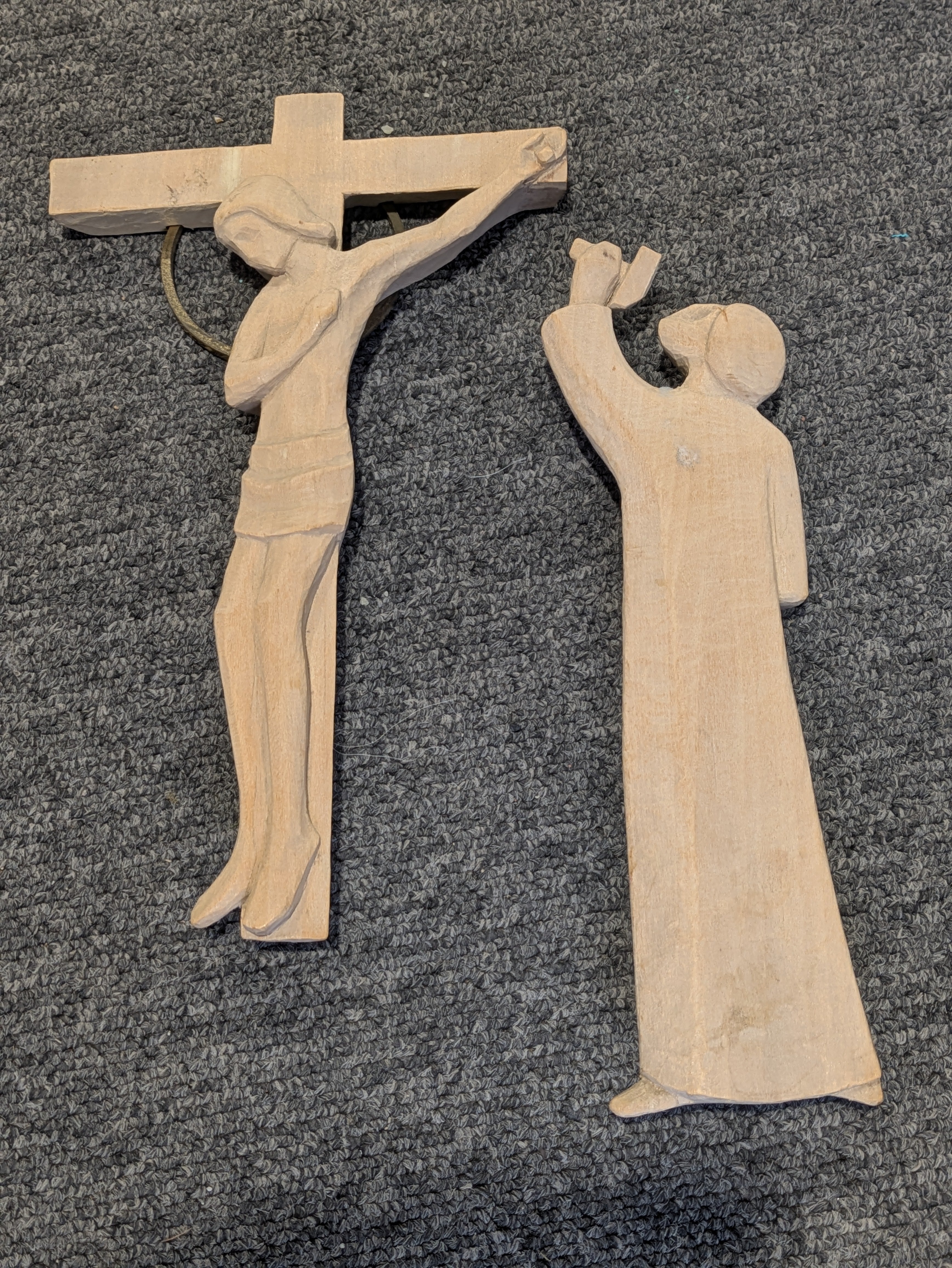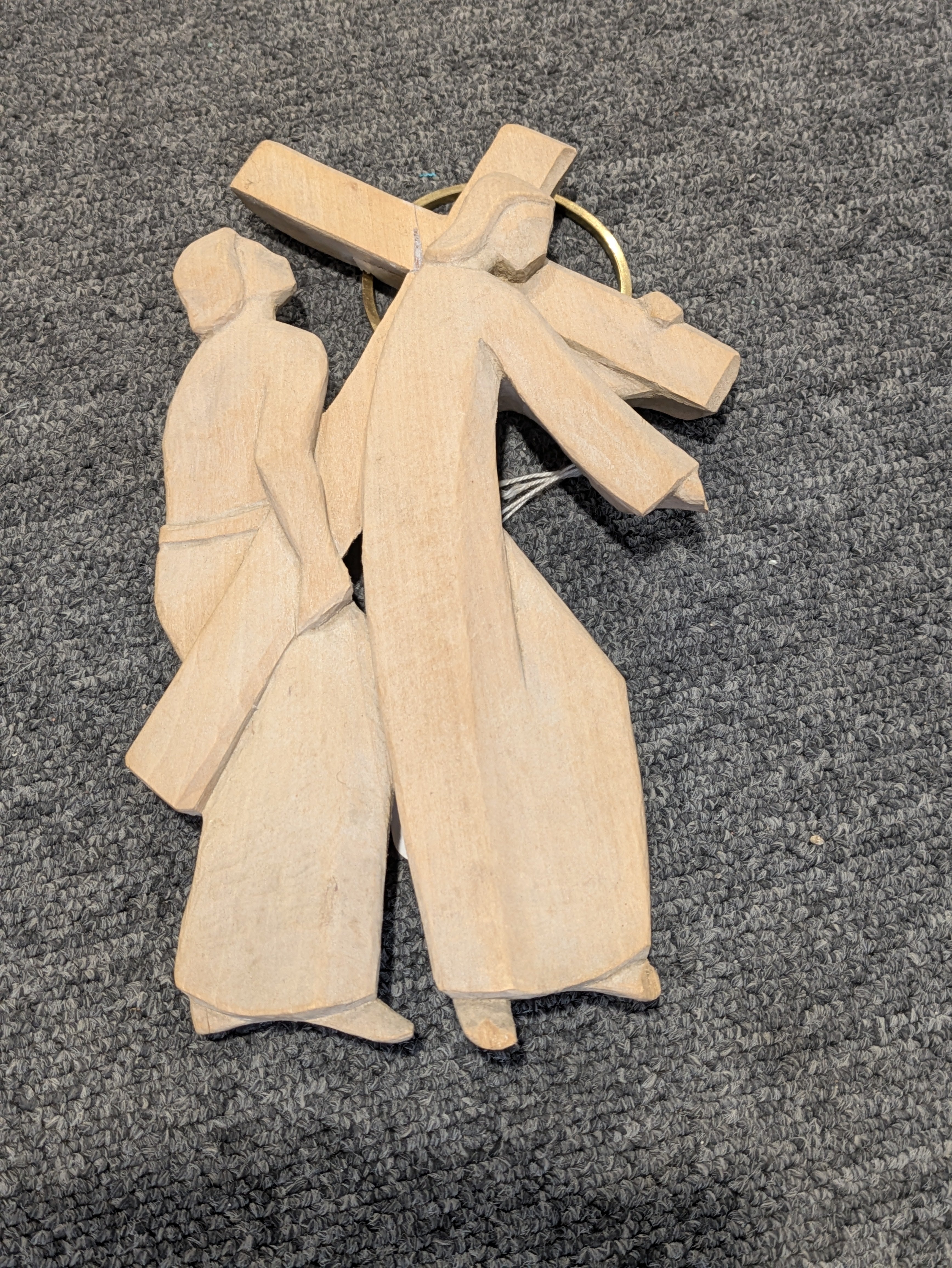 Stations of the cross, carved in limewood and lightly waxed, with brass halo to rear contemporary design - some areas of slight damaged - figure size approx. 8 1/2"