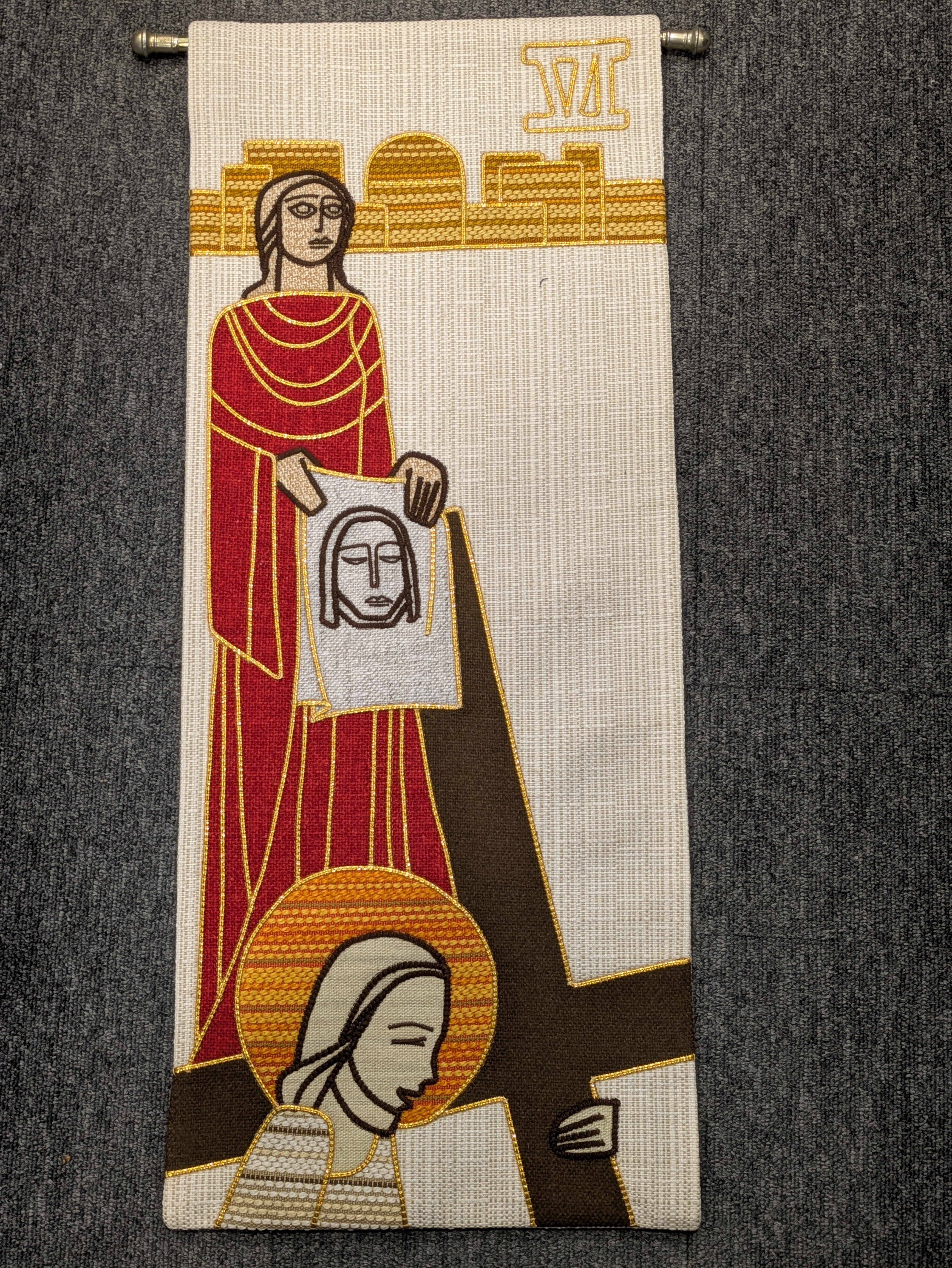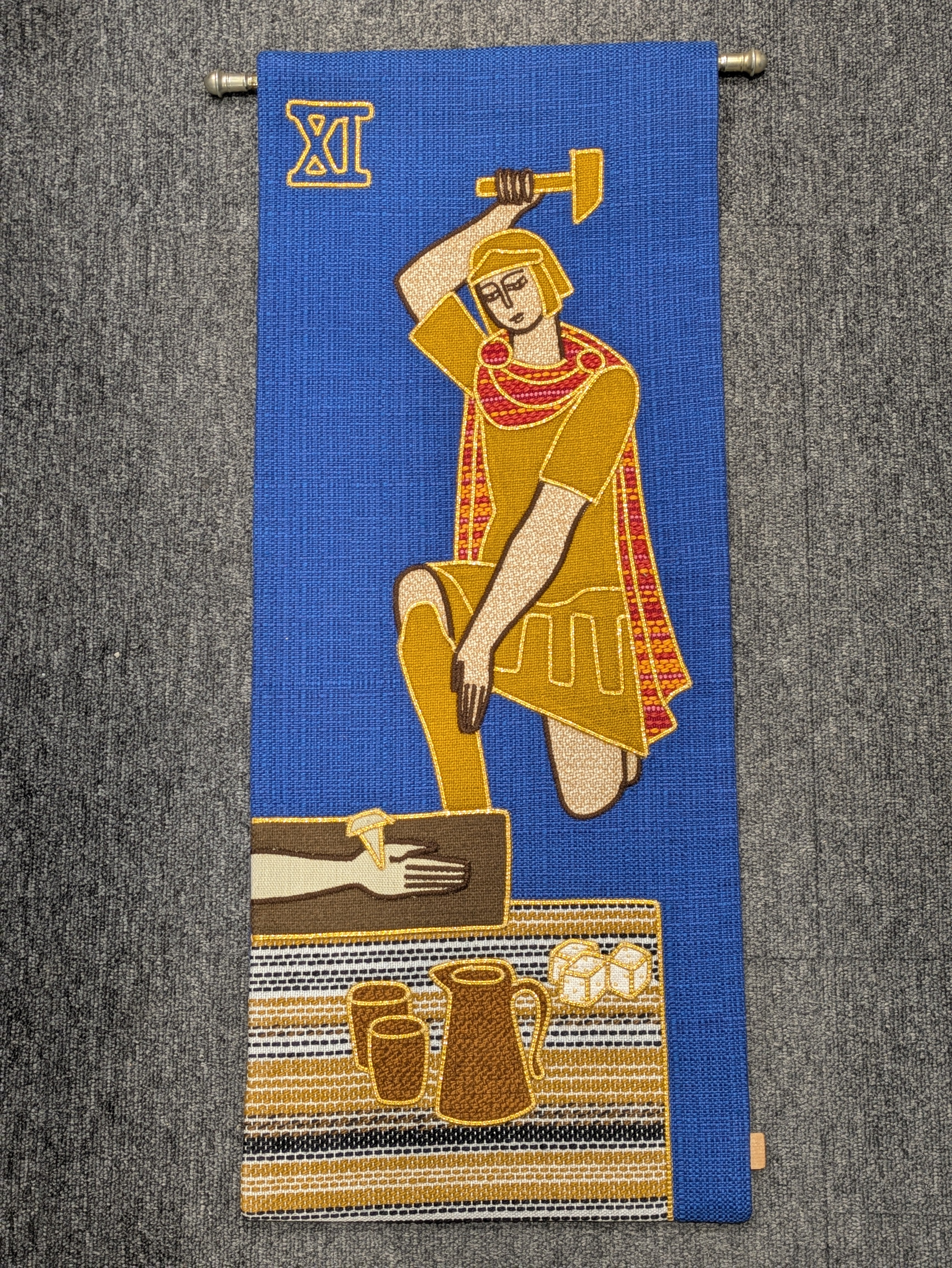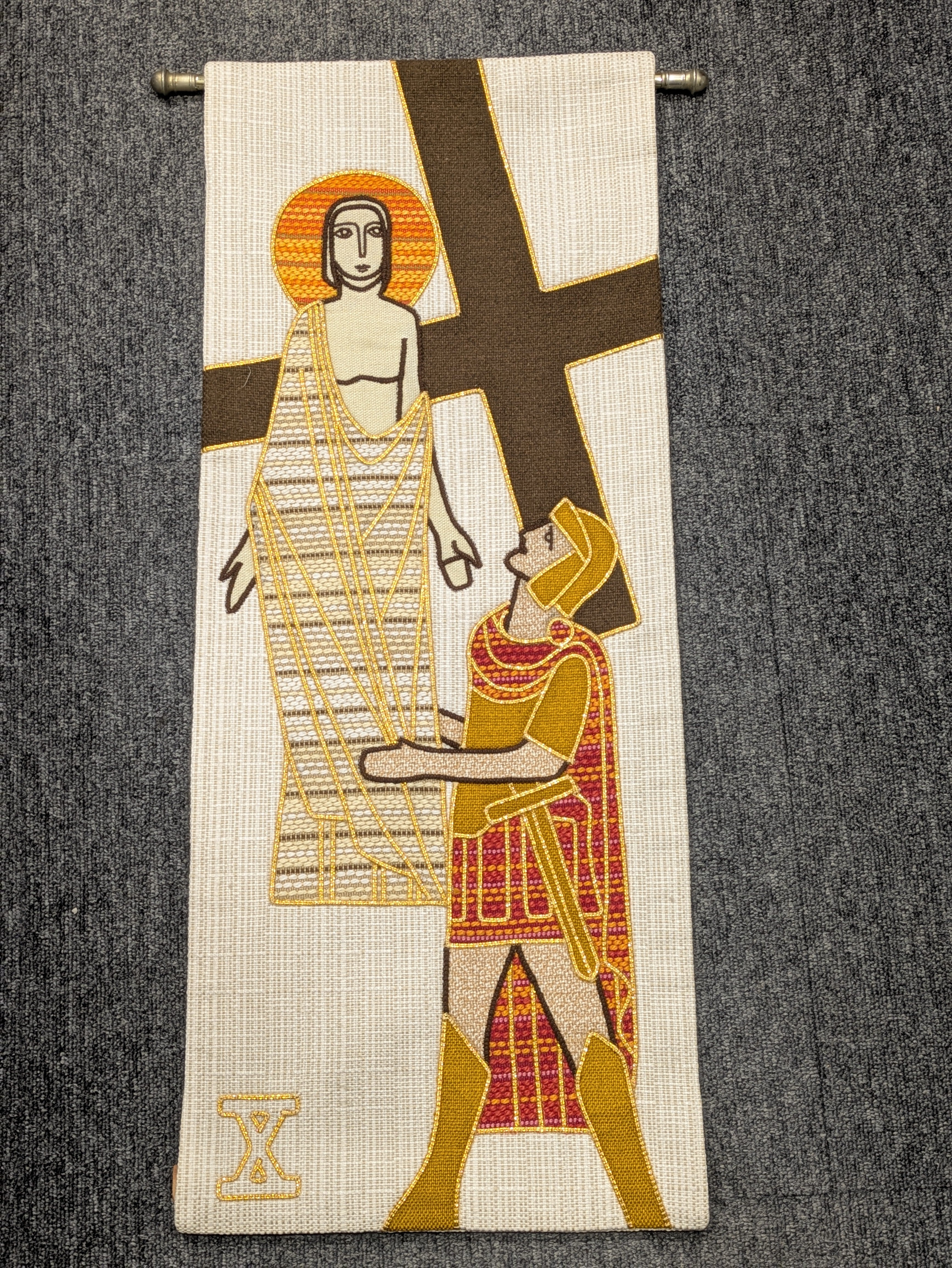 Set of unusual 'Slabbinck' design Stations of the Cross, in contemporary open-weave materials, size of each station approx. 31 1/2" x 12 1/2" complete with brass hanging rods (circa 1995)