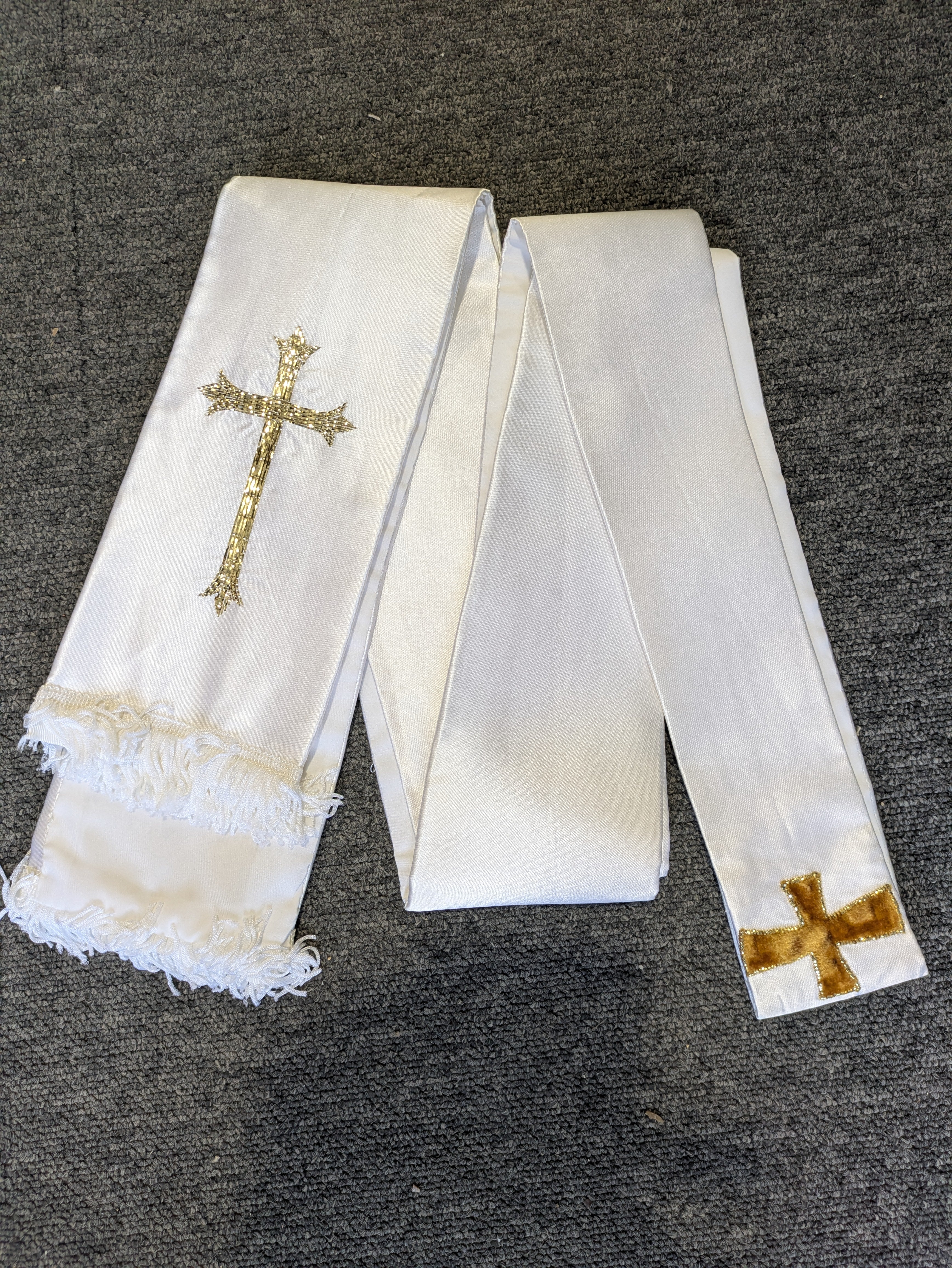 Stole in white satin with decorative gold stitch cross and white fringe to ends, lined in white