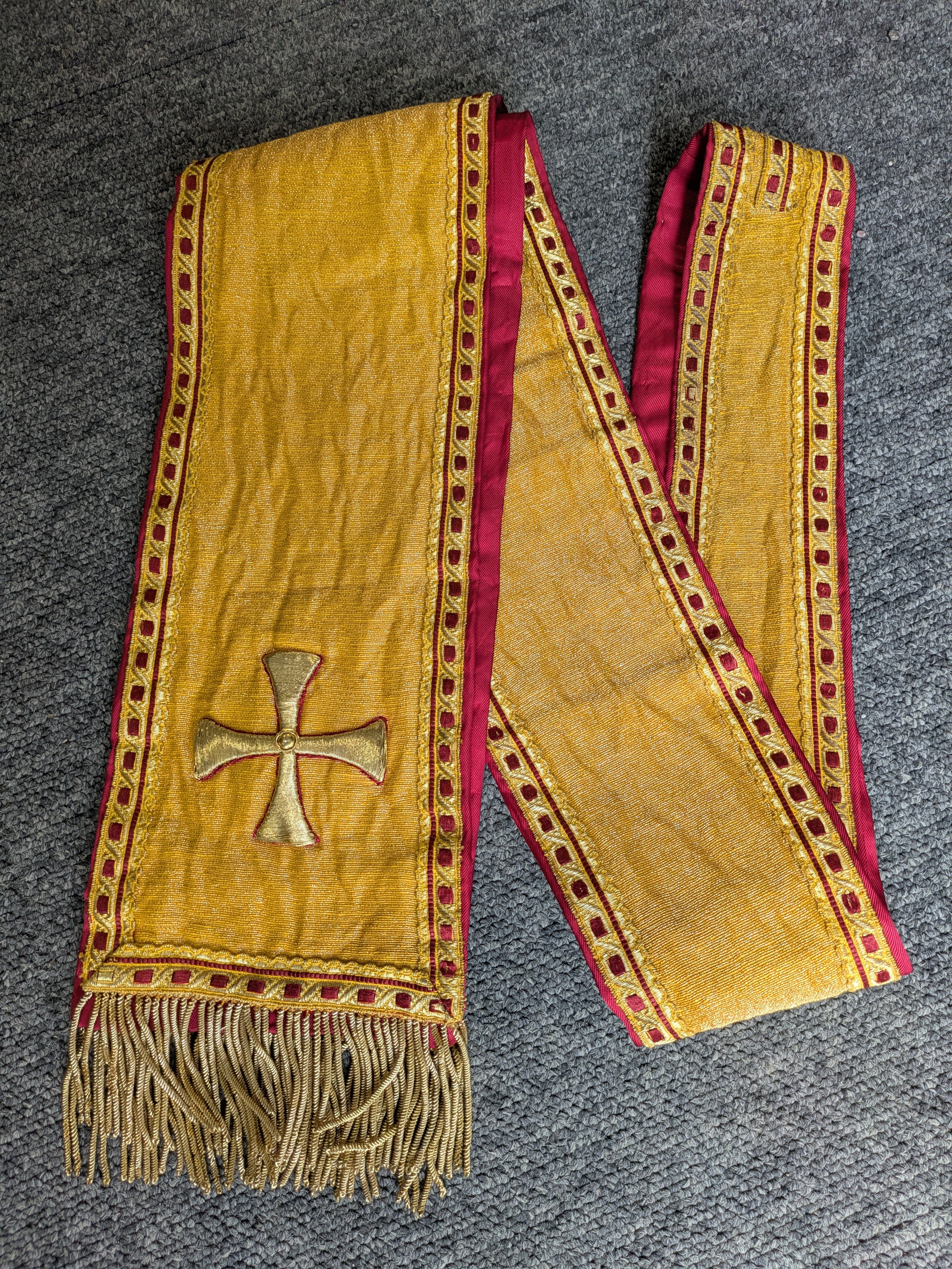 Stole in metallic gold, braided all round with metallic gold embroidered cross, metallic gold fringe, lined red satin (39" long)