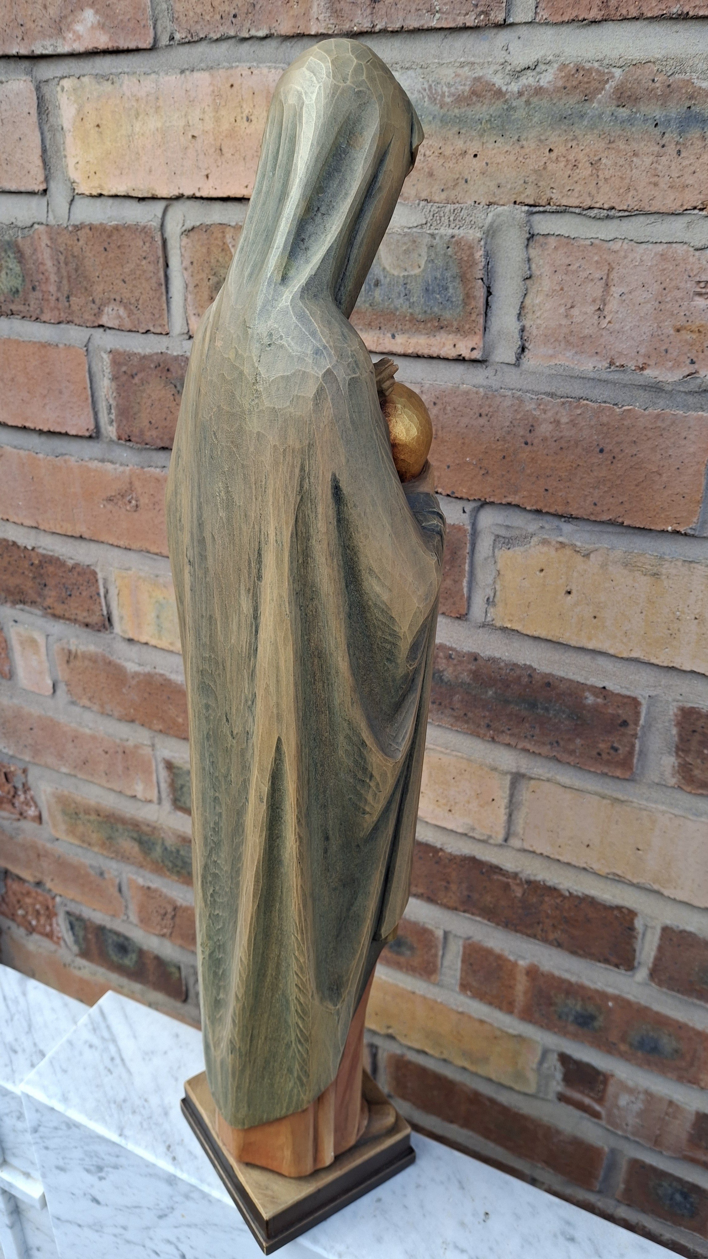 Secondhand carved statue of Our Lady & Child, approximately 24" high, lightlycoloured with gilded highlights